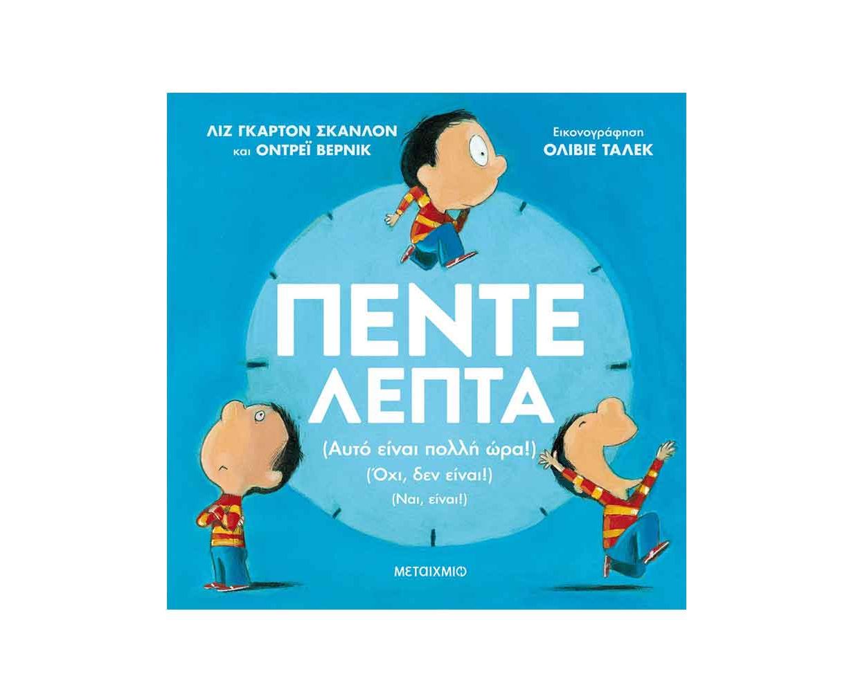 Πέντε λεπτά είναι πολύς χρόνος… ή μήπως όχι; Εξαρτάται, βέβαια, από το τι κάνεις! Ακολούθησε ένα αγοράκι στη διάρκεια μιας πολυάσχολης μέρας του, κατά την οποία ανακαλύπτει ότι μερικές φορές πέντε λεπτά μοιάζουν με αιωνιότητα –όπως όταν κάθεσαι στην καρέκλα του οδοντίατρου ή όταν περιμένεις στη σειρά για την τουαλέτα– και άλλες πάλι είναι ελάχιστα – όπως όταν παίζεις το αγαπημένο σου παιχνίδι ή όταν η μαμά σού διαβάζει το βράδυ πριν κοιμηθείς.
