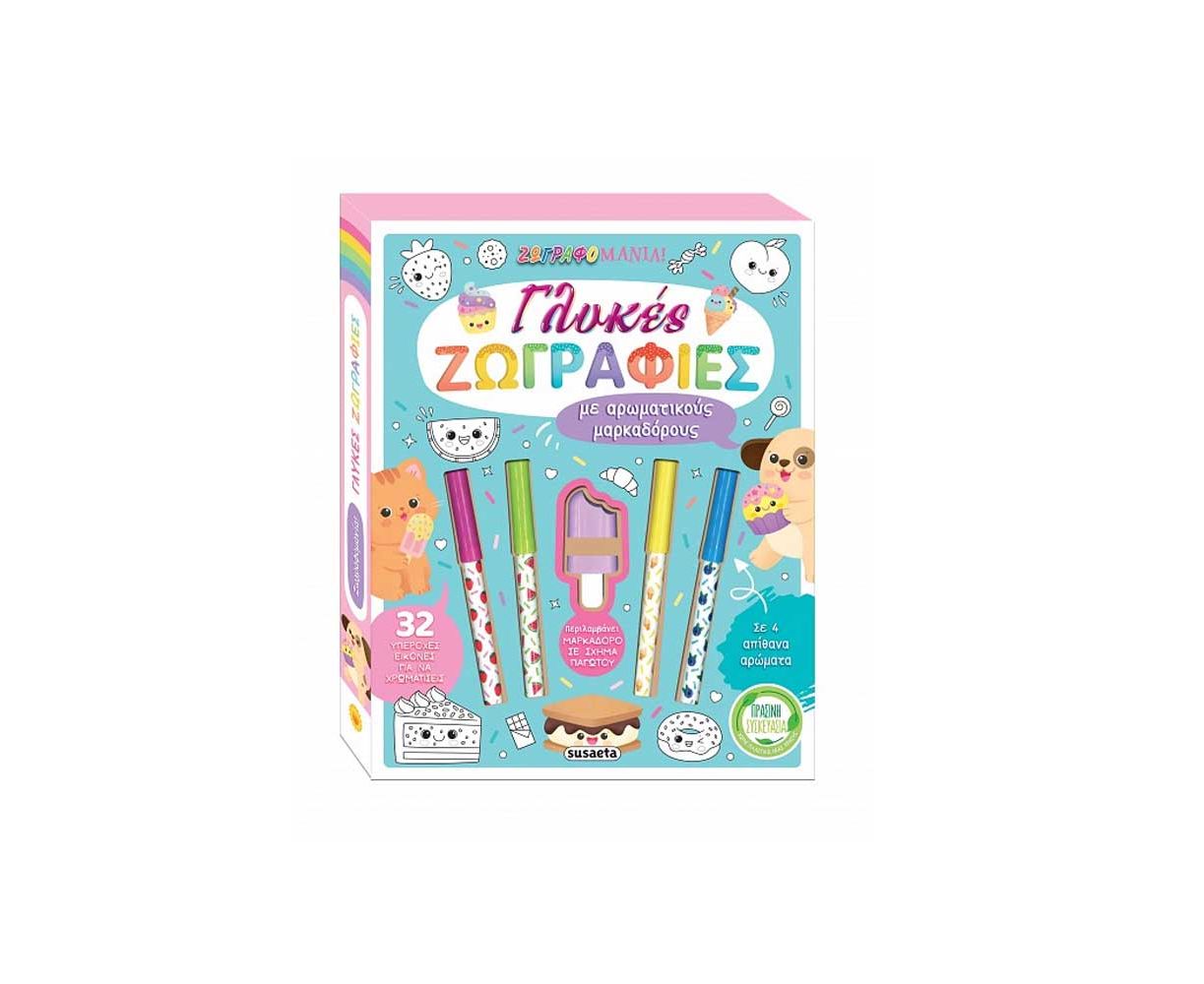 Σε αυτό το υπέροχο κουτί θα βρεις ένα μπλοκ ζωγραφικής με 32 χαριτωμένες εικόνες, για να τις ζωντανέψεις με τα χρώματα που θέλεις. Όλες τους είναι γλυκές, χαρούμενες και τρυφερές! Χάρη στους 4 αρωματικούς μαρκαδόρους και τον πρωτότυπο μαρκαδόρο σε σχήμα παγωτού, θα έχεις όλη την έμπνευση που χρειάζεσαι για να δημιουργήσεις τις πιο ονειρεμένες σκηνές με αξιολάτρευτα ζωάκια, λαχταριστά γλυκά, καρδούλες, ουράνια τόξα και πολλά άλλα!