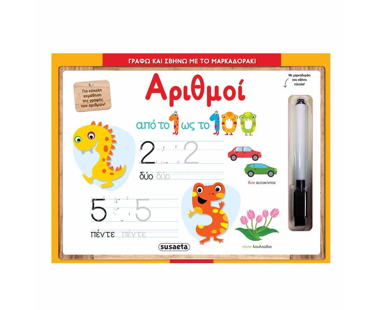Χάρη στο μαρκαδοράκι που θα βρεις στο βιβλίο, γράψε και σβήσε όσες φορές θέλεις μέχρι να μάθεις να γράφεις τέλεια την αλφαβήτα και τους αριθμούς.