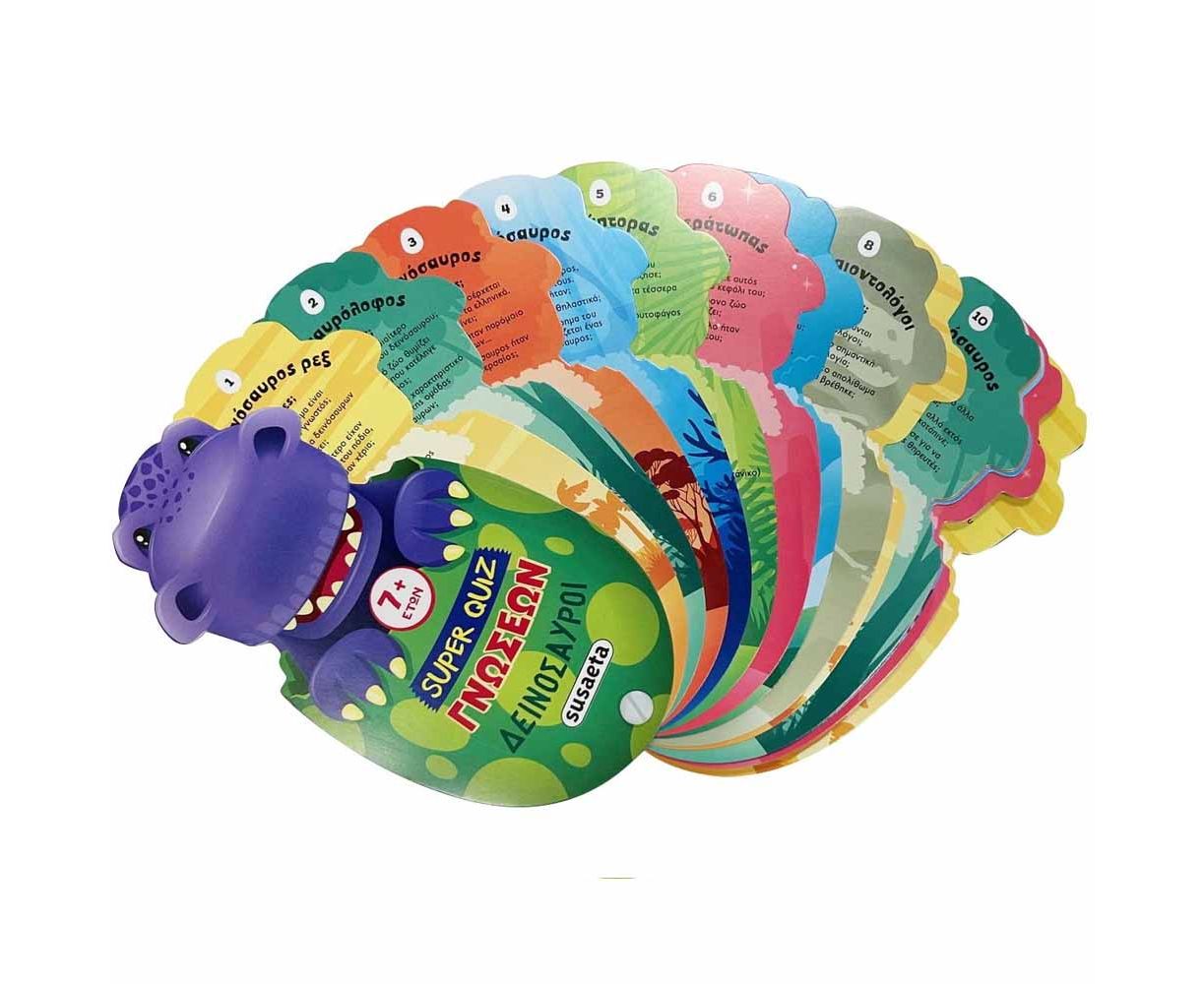 Πάνω από 200 ερωτήσεις, απαντήσεις και ενδιαφέρουσες πληροφορίες μέσα σε καρτέλες που ανοίγουν σαν βεντάλια, για να ανακαλύψεις τον κόσμο των δεινόσαυρων, να παίξεις και να διασκεδάσεις, ασκώντας παράλληλα τη μνήμη και την κριτική σου σκέψη!