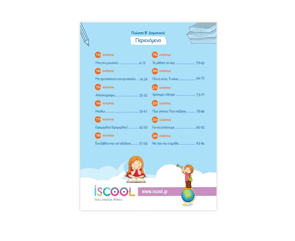 Το βιβλίο Φύλλων εργασίας Γλώσσας ακολουθεί αναλυτικά το σχολικό βιβλίο, περιλαμβάνει όλη την αντίστοιχη ύλη της τάξης, με έμφαση στην κλίση ρημάτων, ουσιαστικών, ασκήσεις με επιρρήματα, αριθμητικά και δημιουργία κειμένων. Στην iScool αναζητούμε διαρκώς την ποιοτικότερη ενασχόληση του ίδιου μαθητή. Δημιουργούμε ελκυστικό, απλό και κατανοητό περιβάλλον εκπαίδευσης, ώστε οι μικροί μας μαθητές να αγαπήσουν το διάβασμα, να εμπεδώσουν την ύλη με ευχάριστο τρόπο, να αναπτύξουν την κριτική τους σκέψη και να τεθούν οι σωστές βάσεις για τις επόμενες τάξεις.