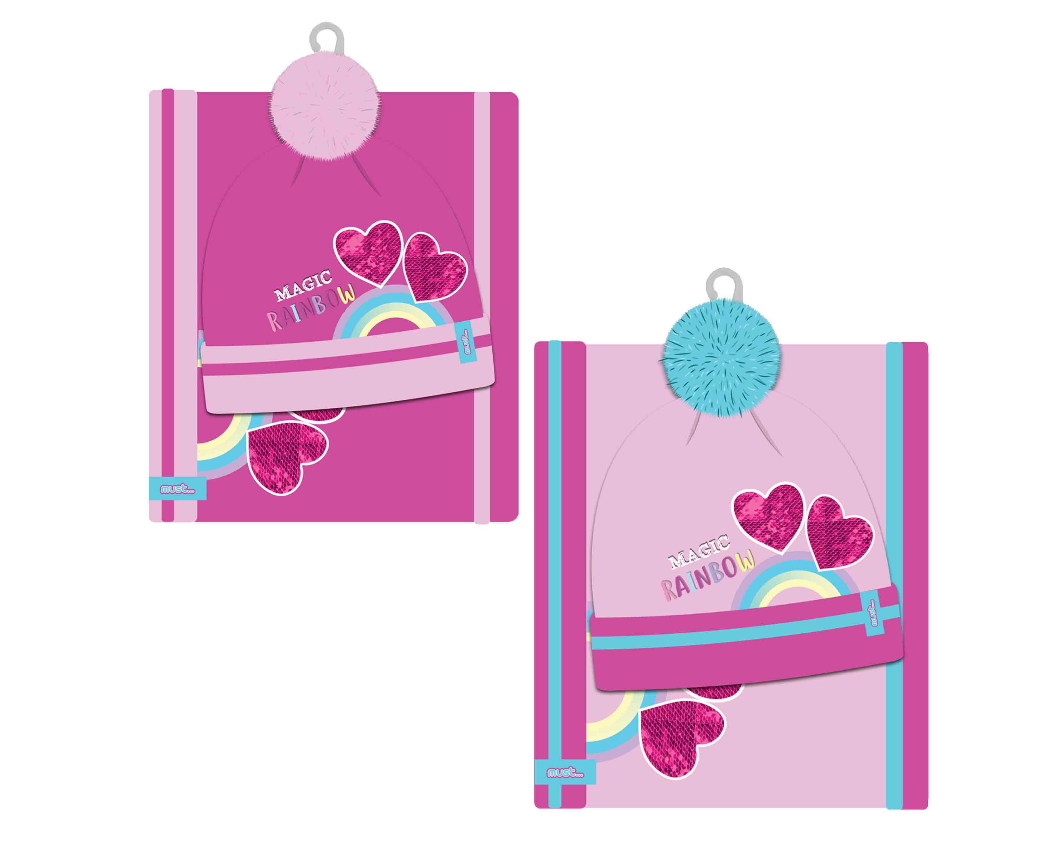 Παιδικό Σετ Σκουφάκι & Κασκόλ Λαιμού Must Magic Rainbow σε 2 υπέροχα σχέδια που θα ενθουσιάσει κάθε κορίτσι με το εντυπωσιακό ουράνιο τόξο και τις γεμάτες με πούλιες κόκκινες καρδιές!