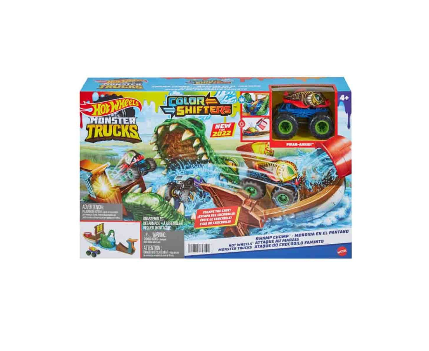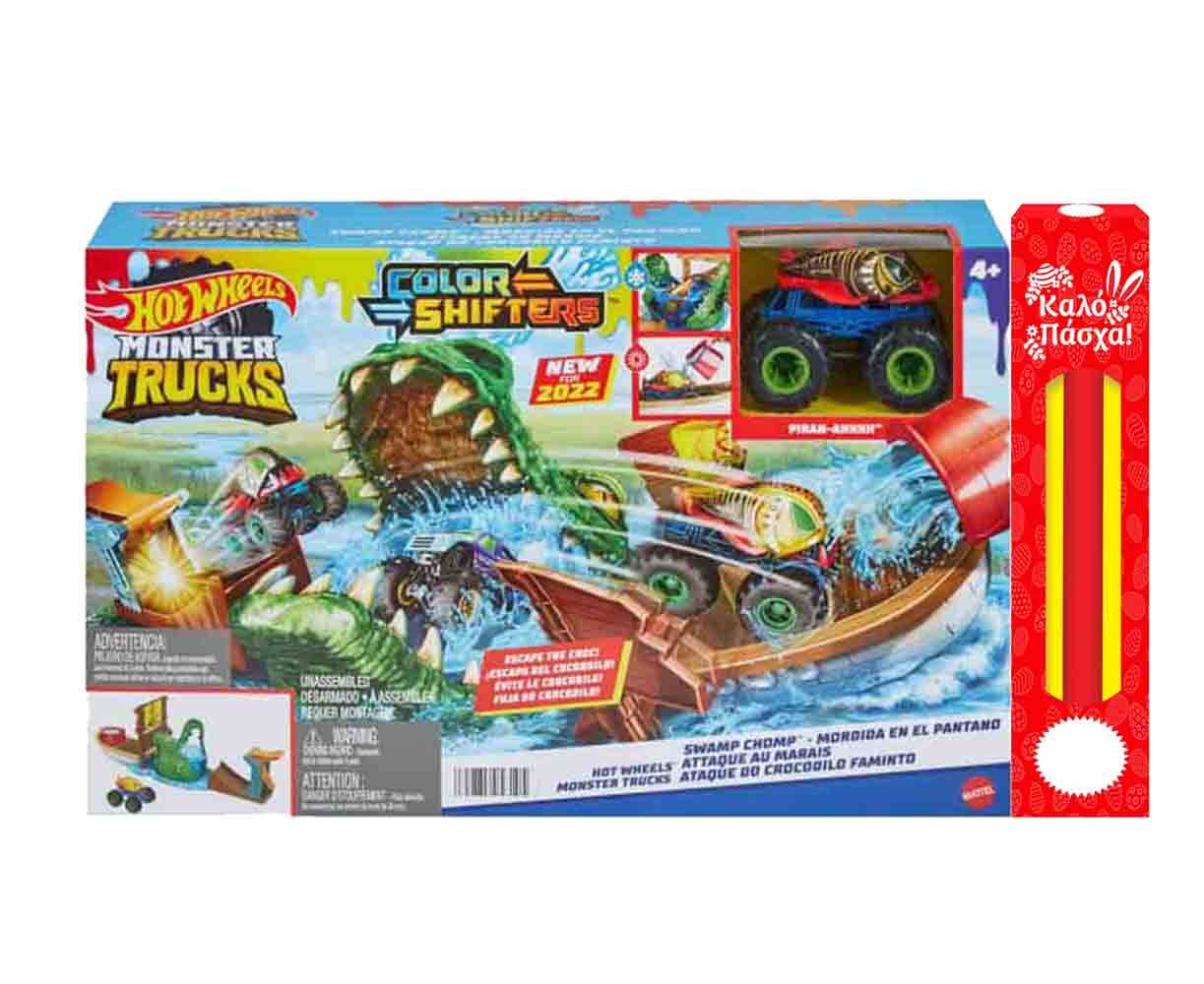 Με το σετ Hot Wheels Monster Trucks με Κροκόδειλο, οι συγκρούσεις και οι εκπλήξεις με την αλλαγή χρώματος είναι συναρπαστικές! Εκτοξεύστε τον Χρωμοκεραυνό και όταν πέσει μέσα στο στόμα του κροκόδειλου με το κρύο νερό, δείτε το να αλλάζει χρώμα! Στείλτε πάλι τον Χρωμοκεραυνό να συγκρουστεί στην πινακίδα και σε ένα σκάφος, όπου μπορείτε να το βάλετε σε ζεστό νερό για να αλλάξετε πάλι την εμφάνισή του! Επαναλάβετε τις διαδρομές για να αλλάξετε εμφάνιση ξανά και ξανά! Το σκάφος και το δοχείο στο στόμα του κροκόδειλου αποτρέπουν τις διαρροές και κρατούν το νερό στην περιοχή του παιχνιδιού. Τα χρώματα και τα σχέδια μπορεί να διαφέρουν.