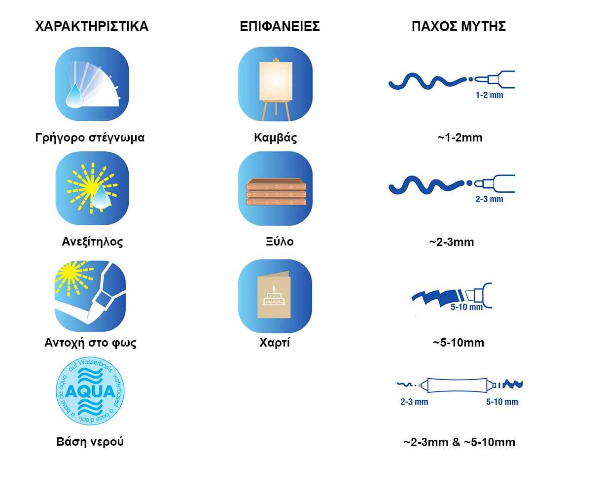 - Ακρυλικός μαρκαδόρος για ζωγραφική σε ανοιχτές ή σκούρες επιφάνειες, ιδανικός για υλικά όπως καμβά, ακουαρέλα και ξύλο
