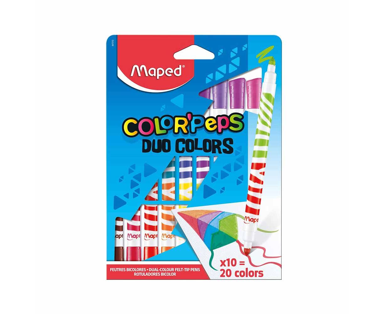 Οι μαρκαδόροι Maped duo είναι μακράς διάρκειας και χαρίζουν ζωηρά χρώματα. Έχουν διπλή μύτη με διαφορετικά χρώματα και καθαρίζονται από τα χέρια και τα ρούχα με νερό και σαπούνι.