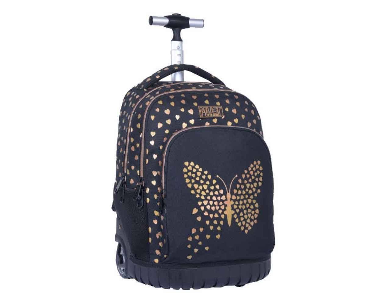 Σχολική Τσάντα Τρόλεϊ Δημοτικού Must Team Gold Butterfly με 3 θήκες σε εντυπωσιακό σχέδιο με πεταλούδα ! Πρακτική και ανθεκτική σχολική τσάντα με εργονομικό σχεδιασμό και τηλεσκοπική λαβή για ασφαλή, άνετη και εύκολη μεταφορά όλων των απαραίτητων σχολικών ειδών στο σχολείο. Μια ξεχωριστή σχολική τσάντα δημοτικού που συνδυάζει την άνεση ενός σακιδίου με την πρακτικότητα ενός τρόλεϊ.