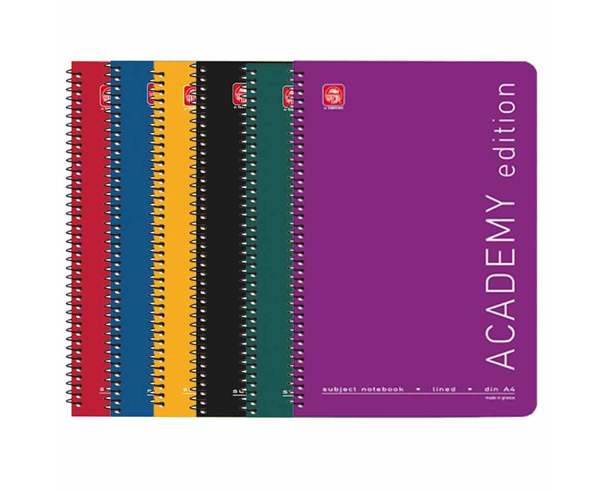 Τετράδιο μονό Σπιράλ Academy ριγέ σε 6 Χρώματα με πλαστικοποιημένο εξώφυλλο 350gsm . Αποτελείται απο χαρτί 70gsm και έχει στρογγυλεμένες γωνιές.