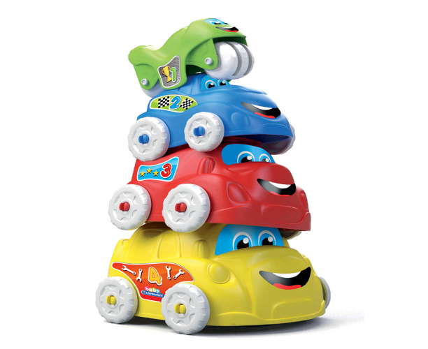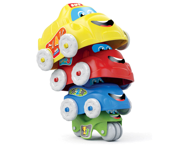 Πυραμίδα με 4 χαριτωμένα οχήματα: λεωφορείο, φορτηγό, αυτοκίνητο και μηχανή. Τα οχήματα μπορούν να στοιβαχτούν με 2 διαφορετικούς τρόπους. Το παιδί αναπτύσσει την απτική και την οπτική του αντίληψη. Επεξεργάζεται το παιχνίδι και ανακαλύπτει τους διαφορετικούς τρόπους χρήσης του. Σε δευτερεύουσα φάση, μέσα από το παιχνίδι και τον πειραματισμό μαζί του έρχεται σε μια πρώτη μικρή επαφή με ποσοτικές έννοιες και έννοιες μεγέθους (μικρότερο, μεγαλύτερο, λιγότερα, περισσότερα).