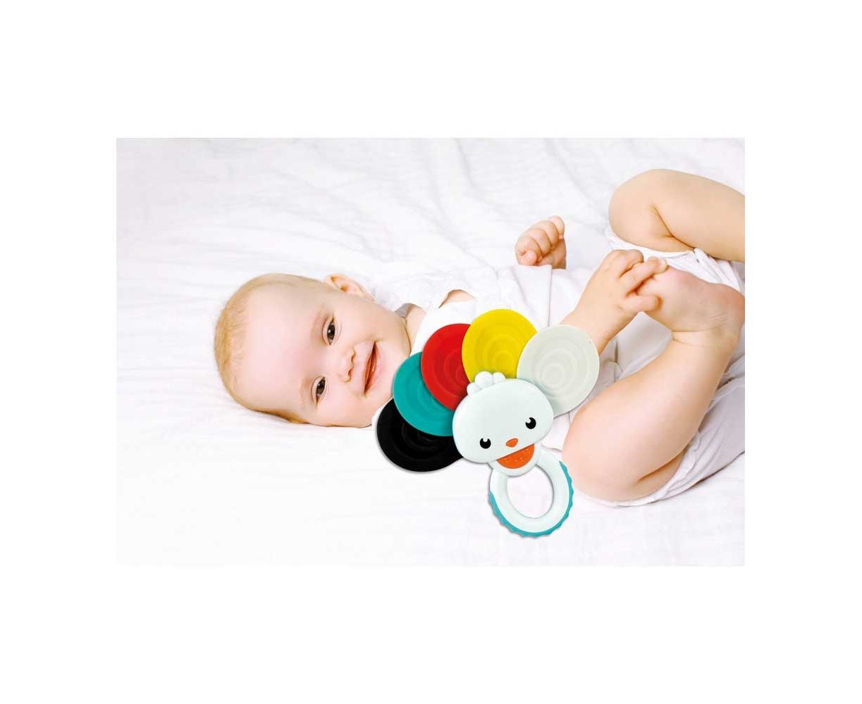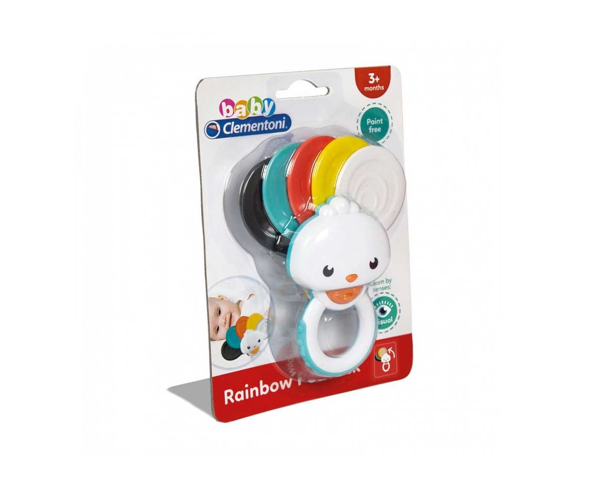 Κουδουνίστρα παγώνι, ιδανική για την ανάπτυξη της όρασης. Ανοίξτε τα φτερά και επικαλύψτε τα για να δημιουργήσετε νέα χρώματα, το μαλακό υλικό την κάνει ιδανική για τα δόντια.