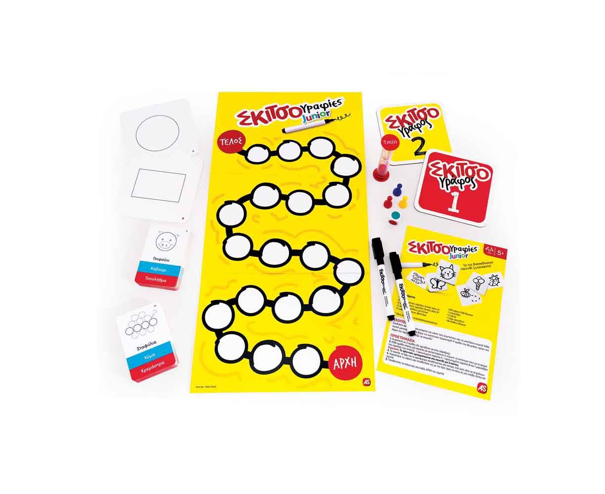 Το πιο διασκεδαστικό παιχνίδι ζωγραφικής για παιδιά! Μπορούν οι συμπαίκτες σου να μαντέψουν τι σκιτσάρεις; Πόσο δυνατή ομάδα είστε; Σε αυτό το παιχνίδι περιλαμβάνονται επιπλέον προτυπωμένες καρτέλες με σχήματα που διευκολύνουν τα παιδιά να σκιτσάρουν. Κάθε κάρτα θεμάτων περιέχει τρία διαφορετικά θέματα. Το χρώμα του κάθε θέματος καθορίζει τον βαθμό δυσκολίας και τα βήματα που θα κάνει το πιόνι της ομάδας αν μαντέψει σωστά το σκίτσο. Έτσι, δίνεται η επιλογή σε μικρότερα παιδιά, να παίξουν μόνο με τα εύκολα θέματα και τις προτυπωμένες καρτέλες!