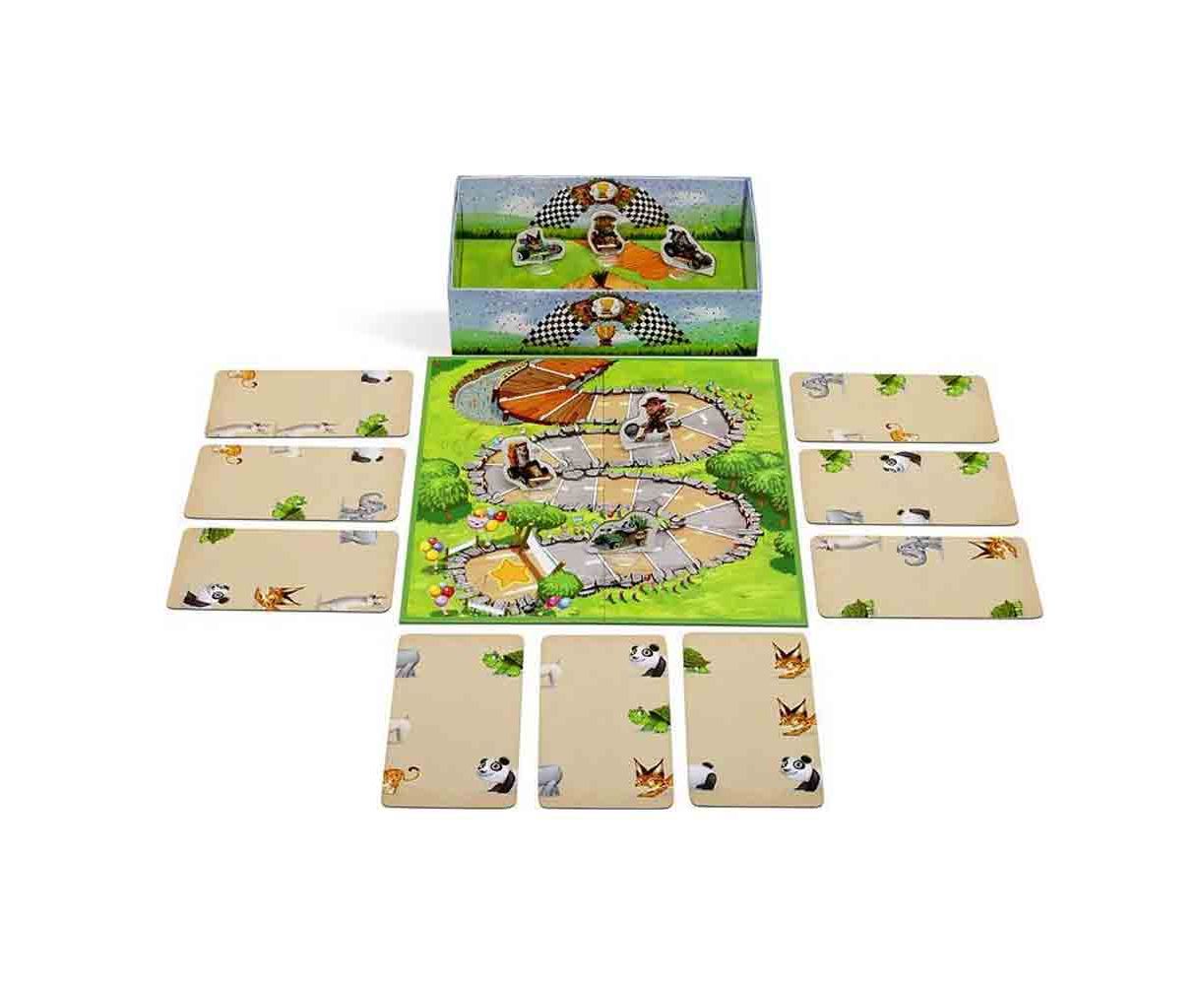 Τοποθετήστε τις κάρτες σας ώστε να σχηματίζουν ολοκληρωμένα ζωάκια και συνεργαστείτε για να τα βοηθήσετε να δραπετεύσουν από τον Ζωολογικό Κήπο προτού έρθει ο φύλακας και κλείσει την πύλη… ή βοηθήστε το αγαπημένο σας ζωάκι να περάσει τη γραμμή του τερματισμού και να κερδίσει τον αγώνας της χρονιάς!