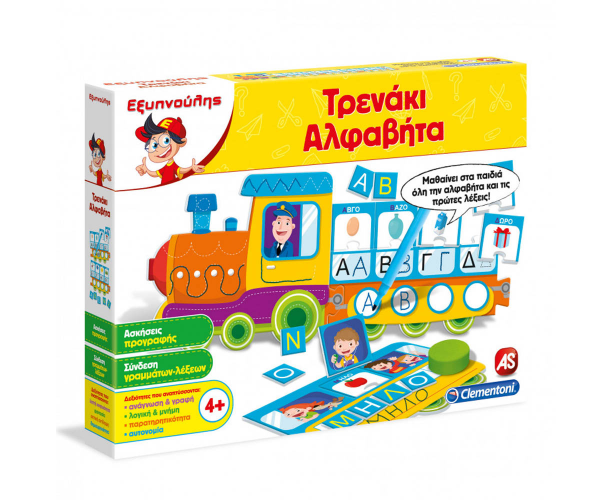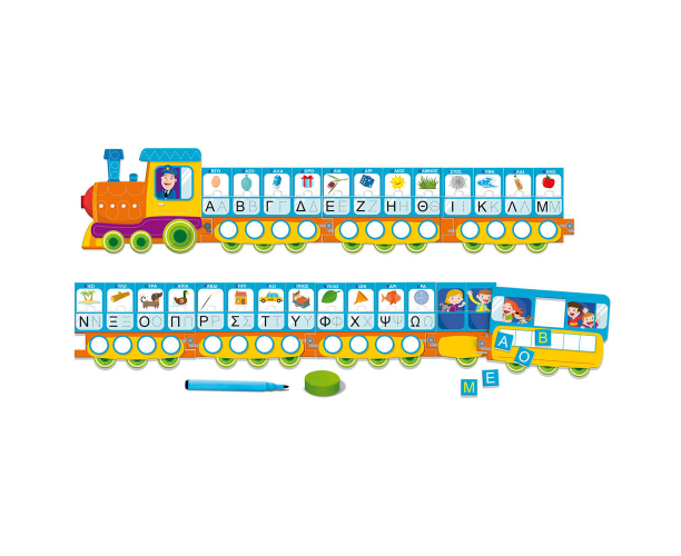 Το Τρενάκι μήκους 2 μέτρων, με τις πολύχρωμες κάρτες-παζλ, το σφουγγαράκι και το μαρκαδόρο που σβήνει, μαθαίνει στο παιδί να γράφει την Αλφαβήτα και τις πρώτες τους λέξεις! Περιλαμβάνονται ασκήσεις προγραφής, ενθαρρύνεται ο συσχετισμός γραμμάτων-λέξεων και η σύνθεση των πρώτων λέξεων.
