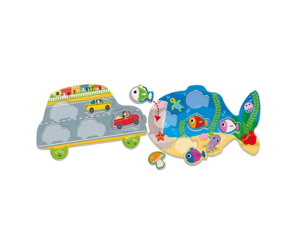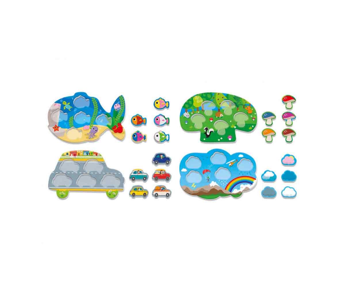 Το "Πού ταιριάζει" είναι ένα παιχνίδι που αποτελείται από 4 μεγάλα ταμπλό και 20 εικονογραφημένες κάρτες. Το κάθε ταμπλό αποτελείται από 5 εσοχές στις οποίες ταιριάζουν 5 κάρτες με αντικείμενα ίδιου σχήματος. Τα παιδιά μπορούν να αρχίσουν να παίζουν απλά παρατηρώντας τις εικόνες στις κάρτες και τοποθετώντας τις στα ταμπλό όπου ταιριάζουν. Όσο εξοικειώνονται με το παιχνίδι, μπορούν να εξασκηθούν προσπαθώντας να αναγνωρίσουν τις κάρτες, ενώ είναι γυρισμένες με την όψη προς τα κάτω, απλά παρατηρώντας προσεκτικά το σχήμα τους. Τέλος, μπορούν διασκεδάσουν παρέα με τους φίλους και την οικογένειά τους, παίζοντας με τις κάρτες ένα παιχνίδι Μπίνγκο.