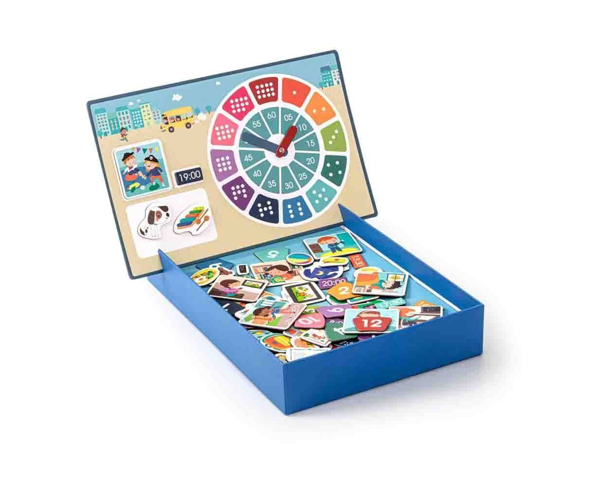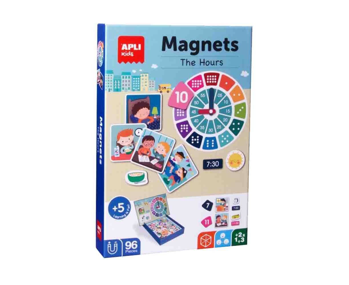 Μαγνητικό παιχνίδι, το μοντέλο των ωρών, για να βοηθήσει τα παιδιά να μάθουν τις ώρες και να συνηθίσουν τις ρουτίνες τους. Κάθε παιχνίδι περιέχει: 1 μαγνητική σκηνή διαστάσεων 28 x 18 cm για να χωρέσει στη βάση του κουτιού και 96 μαγνήτες με τα διάφορα μέρη του ρολογιού και διαφορετικά στάδια και καθημερινές ρουτίνες που βοηθούν στην εκμάθηση των ωρών και των σχετικών ρουτινών. Ένα αποκλειστικό σχέδιο APLI Kids με πρωτότυπες και πολύχρωμες εικονογραφήσεις. Ένα παιχνίδι με υψηλή διδακτική αξία: Ενθαρρύνει την παρατήρηση και τη φαντασία. αυξάνει τη συγκέντρωση και την προσοχή. δημιουργώντας ενδιαφέρον για αντικείμενα και συνήθειες που δεν γνωρίζουν. Συνιστάται για παιδιά 3 ετών και άνω.