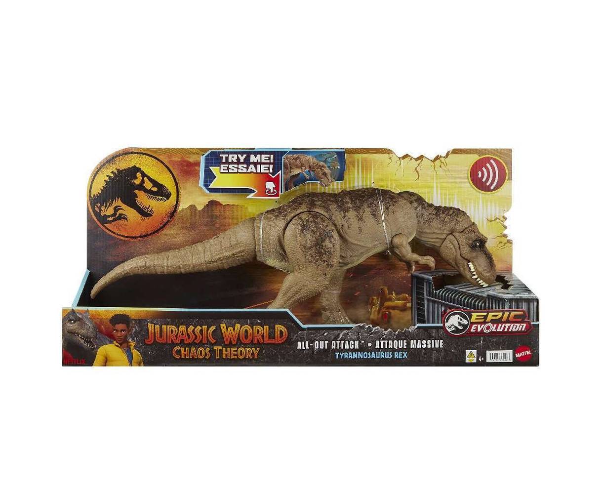 Αυτός ο Tyrannosaurus Rex All-Out Attack δίνει χαρακτηριστικά επίθεσης και «εξελιγμένης μάχης» στο πιο εμβληματικό είδος από όλα. Η αφηνιασμένη επίθεση αυτής της φιγούρας δράσης είναι ένα δραματικό χτύπημα πάνω-κάτω στο λαιμό, μαζί με μια κίνηση μασήματος και ήχους βρυχηθμού. Όσο πιο γρήγορα πατάτε το κουμπί, τόσο μεγαλύτερα είναι οι βρυχηθμοί και τα δαγκώματα! Αυτός ο T. Rex είναι επίσης «εξελιγμένος για μάχη» με δόντια που μεγαλώνουν σχεδόν 2 φορές το μέγεθός τους! Σκανάρετε τον κρυμμένο κωδικό εντοπισμού στη δωρεάν εφαρμογή Jurassic World Play App με μια συμβατή έξυπνη συσκευή (Android ή iOS, δεν περιλαμβάνεται) για να ξεκλειδώσετε μια ψηφιακή έκδοση του δεινόσαυρου και να αποκτήσετε πρόσβαση σε άγρια διασκεδαστικά παιχνίδια!