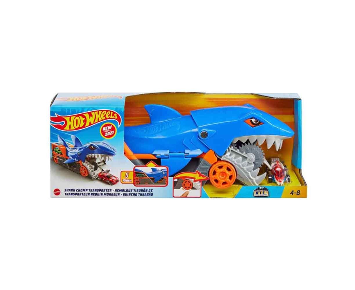 Αυτός ο μεταφορέας εμπνευσμένος από τον καρχαρία στροβιλίζει τα αυτοκίνητα και τα αποθηκεύει στην κοιλιά του για έναν μοναδικό και διασκεδαστικό τρόπο μεταφοράς και αποθήκευσης οχημάτων Hot Wheels. Αυτή η μεγαλύτερη έκδοση του εμβληματικού αυτοκινήτου Shark Bite Hot Wheels έχει μια ράμπα εξόδου που βγάζει τα πίσω αυτοκίνητα στην επόμενη περιπέτειά τους. Το όχημα Hot Wheels Shark Chomp Transport έρχεται με ένα αυτοκίνητο Shark Bite Hot Wheels και μπορεί να χωρέσει έως και τέσσερα ακόμη! (Επιπλέον αυτοκίνητα πωλούνται ξεχωριστά.) Τα παιδιά θα λατρέψουν τα χαρακτηριστικά του shark-chomping που καταπίνουν τα αυτοκίνητα, ενώ οι γονείς θα λατρέψουν τη βολική και διακριτική αποθήκευση που παρέχει όταν δεν χρησιμοποιούνται.