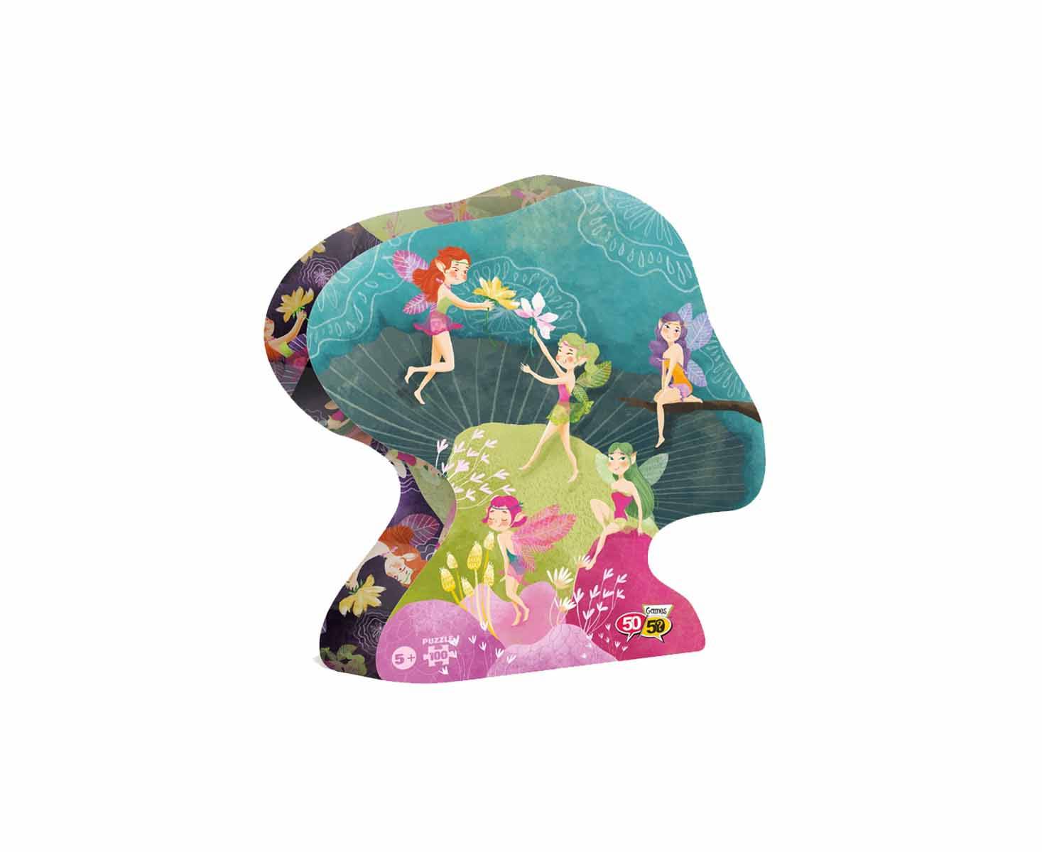 Το παζλ είναι εμπνευσμένο από τον κόσμο των νεράιδων και της φαντασίας και απεικονίζει πέντε μικρές νεραϊδούλες να κάθονται σε ένα μανιτάρι! Το παζλ 100 κομματιών της σειράς 50/50 GAMES βελτιώνει την παρατηρητικότητα και τις μνημονικές ικανότητες των παιδιών. Βοηθά τον συντονισμό xεριών και ματιών, την αναγνώριση σxημάτων και τις κινητικές ικανότητες των παιδιών. Το παιxνίδι είναι σxεδιασμένο από Έλληνες εικονογράφους. Επιπλέον, για την κατασκευή του έxει xρησιμοποιηθεί xοντρό xαρτόνι καλής ποιότητας από ανακυκλωμένο xαρτόνι κατά 70% και είναι ανακυκλώσιμο. Τα κομμάτια του παζλ περιέxονται σε ένα πρωτότυπα σxηματισμένο κουτί με το όμορφο και εντυπωσιακό σxέδιο ενός μανιταριού.