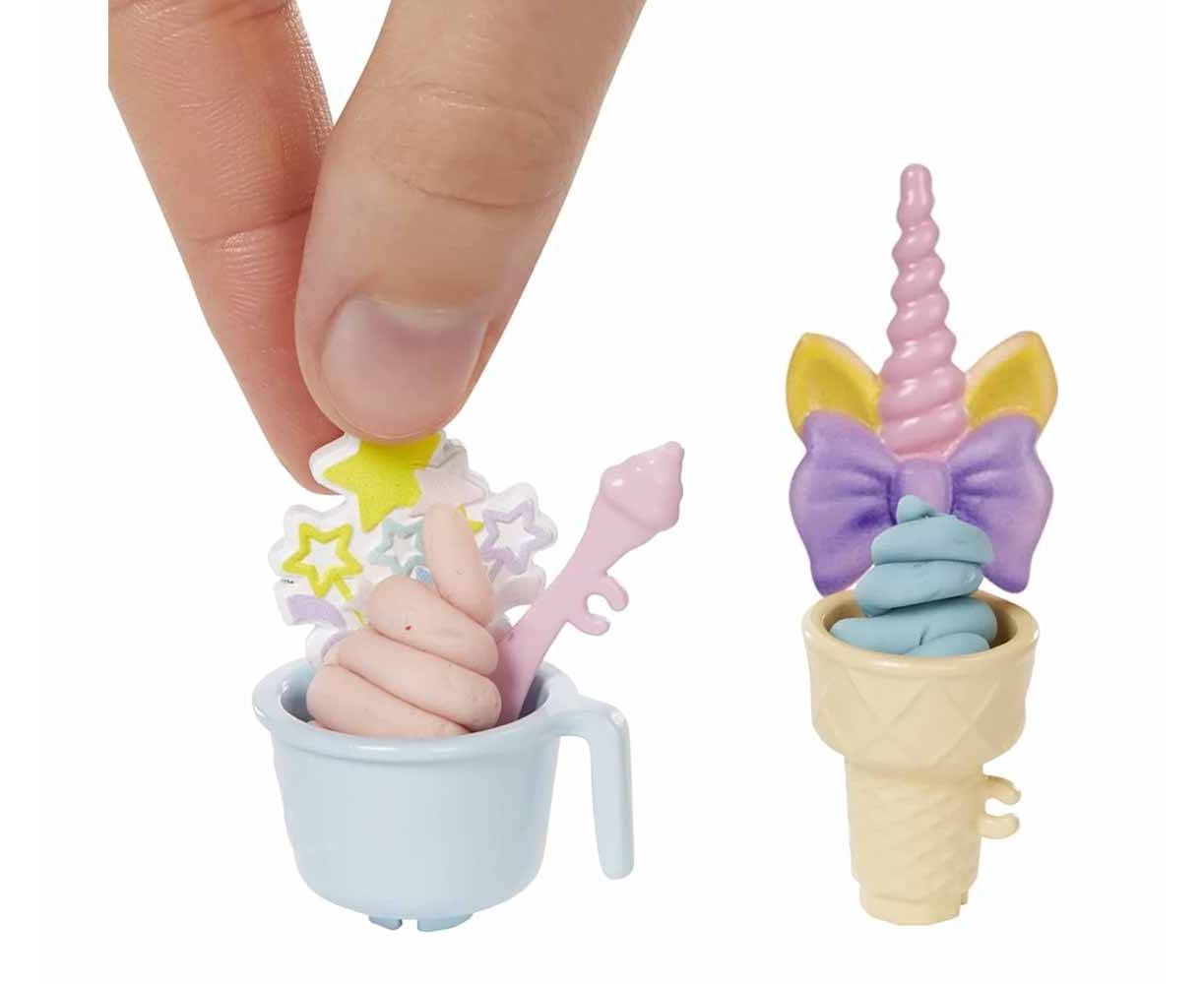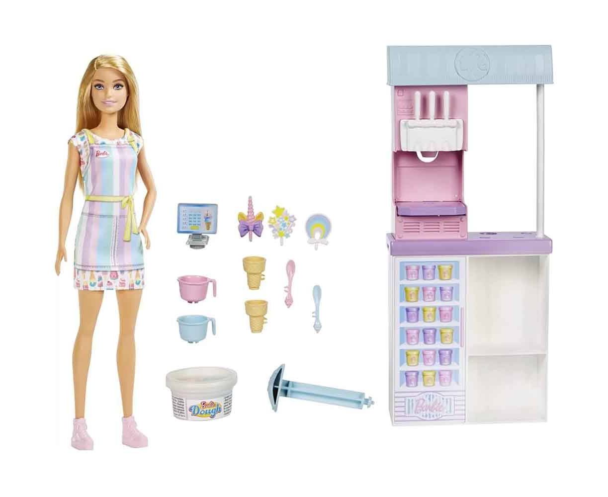 *Η κούκλα δεν μπορεί να σταθεί μόνη της. Περιλαμβάνονται: κούκλα Barbie, σταθμό παγωτού, 2 χρώματα ζύμης, 2 μπολ, 2 χωνάκια, 3 διακοσμητικά toppers, 2 κουτάλια, θήκη για χωνάκια και ταμείο.