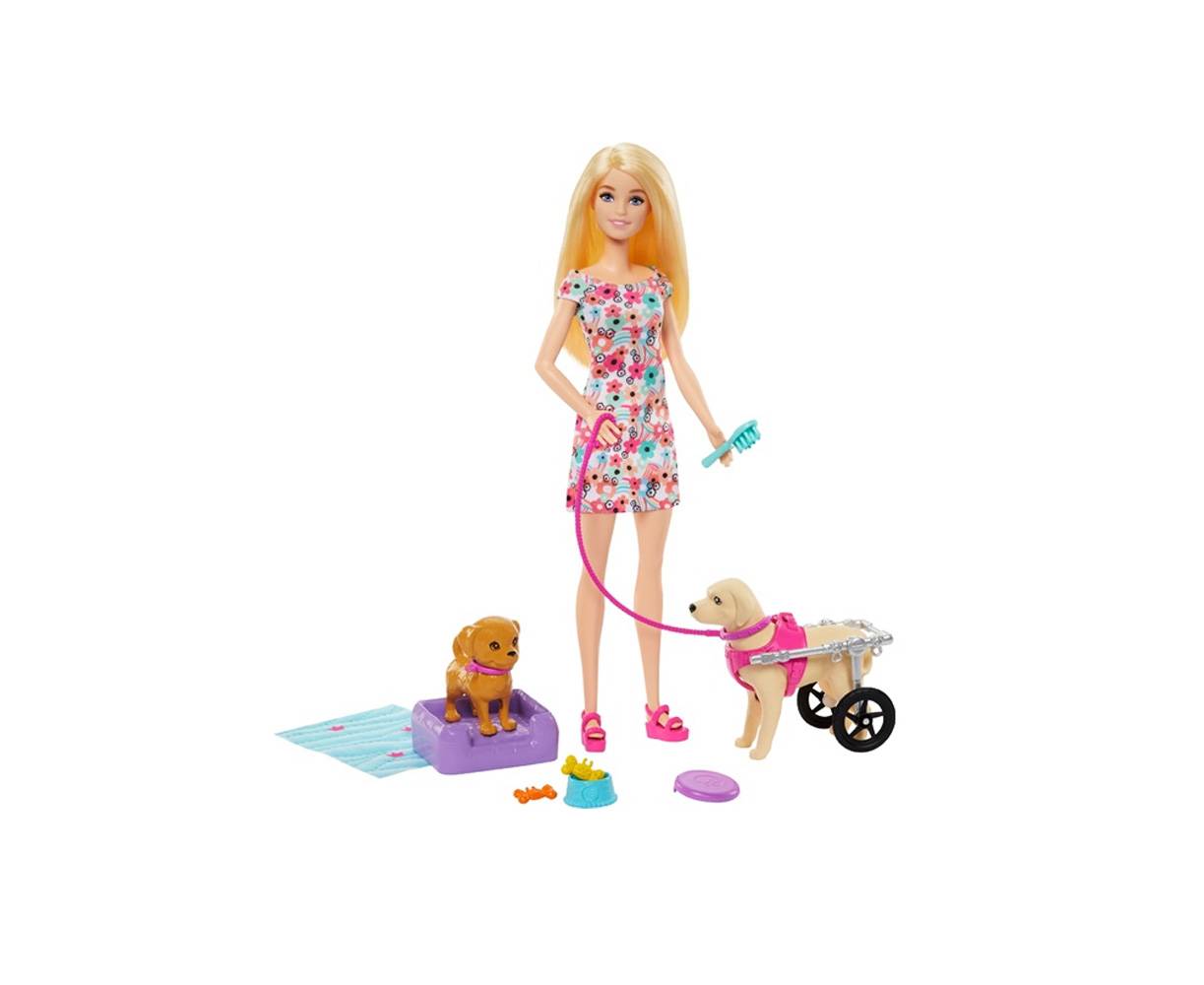 Αυτό το σετ παιχνιδιού περιλαμβάνει ένα κουταβάκι και ένα μεγάλο σκυλάκι που φοράει ένα υποστηρικτικό αναπηρικό αμαξίδιο με ρόδες που γυρίζουν. Τα δύο σκυλάκια τρελαίνονται να βγαίνουν βόλτες με την κολλητή τους φίλη, την Barbie!