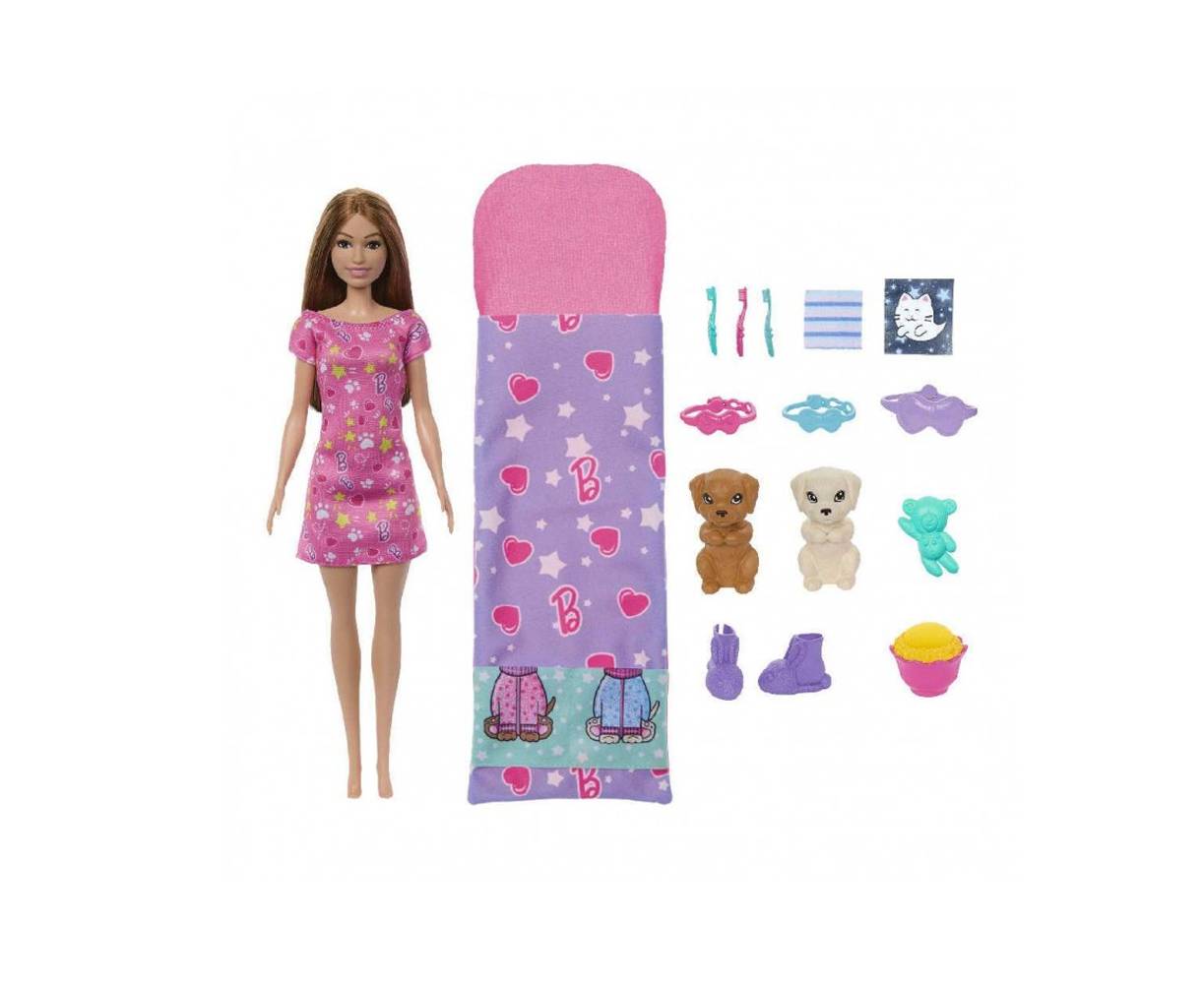 Η Barbie είναι έτοιμη για ένα puppy pijama party! Αυτό το σετ παιχνιδιού περιλαμβάνει μια κούκλα Barbie, δύο αξιολάτρευτα κουτάβια, έναν υπνόσακο και για τους τρεις και 10 αξεσουάρ. Τα παιδιά μπορούν να χρησιμοποιήσουν παγωμένο και ζεστό νερό για να ενεργοποιήσουν το αποτέλεσμα αλλαγής χρώματος και το πρόσωπο του κουταβιού θα αλλάξει από καθαρό σε "βουτυρένιο". Για μια ωραία βραδιά στο σπίτι για sleepover, η Barbie φοράει πιτζάμες και παντόφλες. Όλοι έχουν μια μάσκα ύπνου για γλυκά όνειρα!