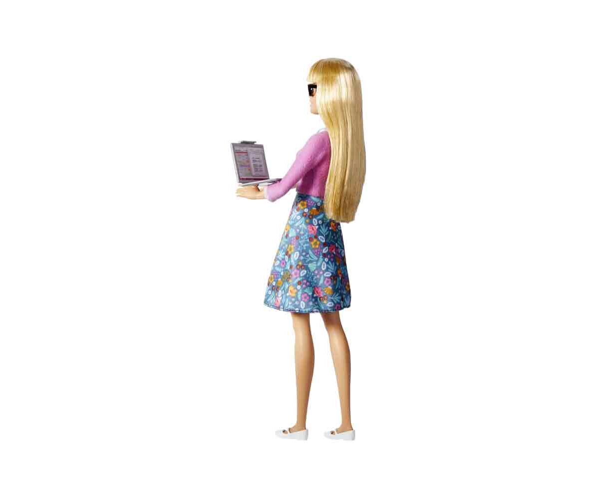 Η Barbie Δασκάλα είναι έτοιμη να ηγηθεί της τάξης με ένα σετ καριέρας που περιλαμβάνει 10 παιχνίδια με θέμα το σχολείο, μερικά με λαβές που μπορεί να κρατήσει η κούκλα Barbie! Μία υδρόγειος σφαίρα και ένας φορητός υπολογιστής που ανοίγει και κλείνει προσελκύει τα νεαρά μυαλά στη διασκέδαση του ρόλου. Τα παιδιά μπορούν να βοηθήσουν την κούκλα Barbie να διδάξει μελέτες STEM με μικροσκόπιο, δύο ποτήρια, δύο φιάλες και ένα ζευγάρι γυαλιά. Ολοκληρώστε το πρόγραμμα σπουδών και την βαθμολόγηση με ένα πρόχειρο και ένα βιβλίο. Η κούκλα Barbie είναι ντυμένη για την τάξη με μια εμφάνιση με ροζ μπλούζα και γαλάζια φλοράρ φούστα, μπλε κολιέ, άσπρα παπούτσια και μαύρα γυαλιά.