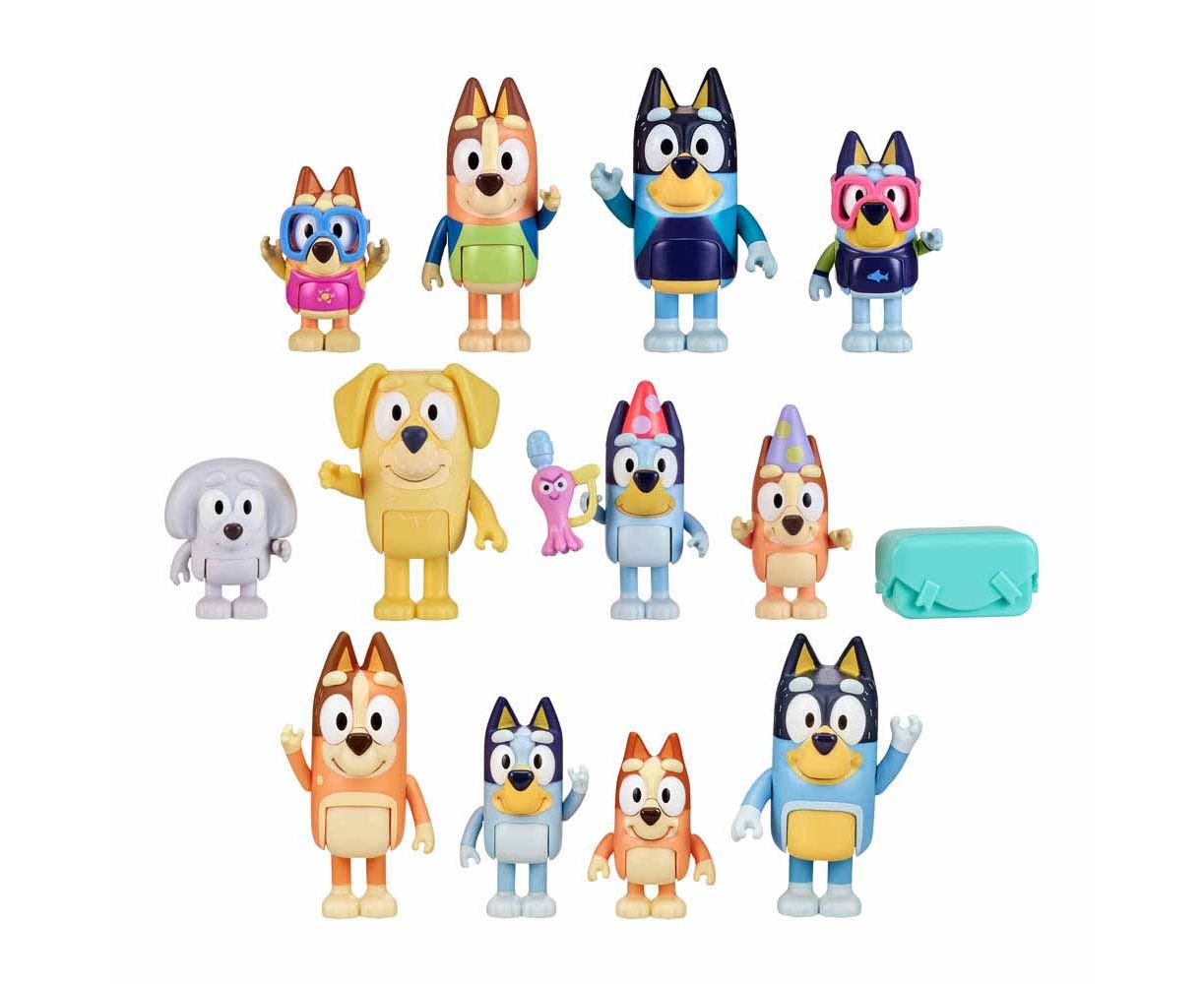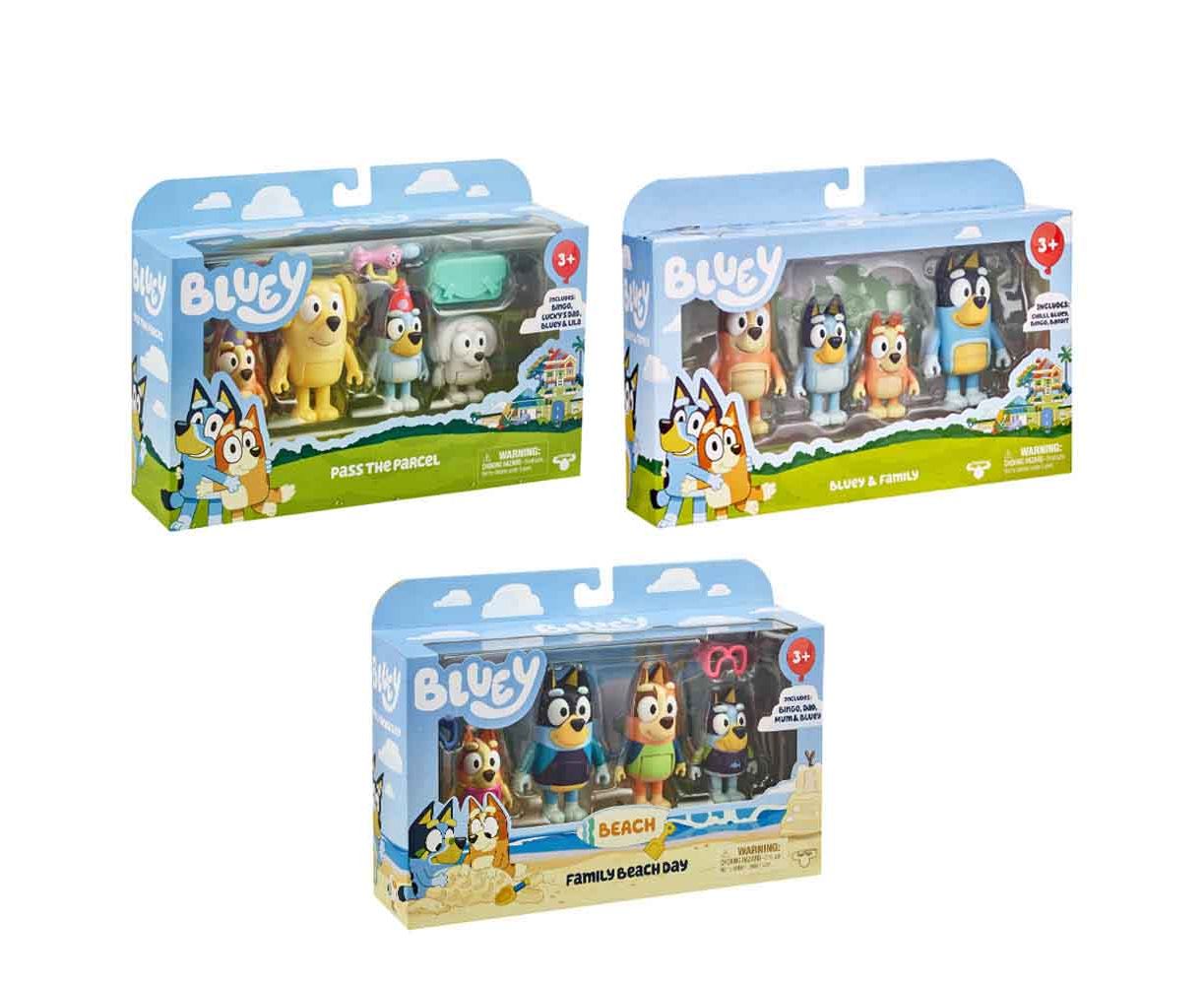 Σετ με 4 φιγούρες ύψους 6 εκ. χαρακτήρων για να αναπαραστήσουν τα παιδιά τον κόσμο της Bluey. Οι φιγούρες διαθέτουν αρθρώσεις σε κορμό και χέρια. H συλλογή διαθέτει 3 θεματικά σχέδια: Family Beach Day (Οικογένεια της Bluey στην παραλία), Bluey & Family (Οικογένεια της Bluey), Pass the parcel (Bingo, Bluey, Lucky’s Dad, Lila).