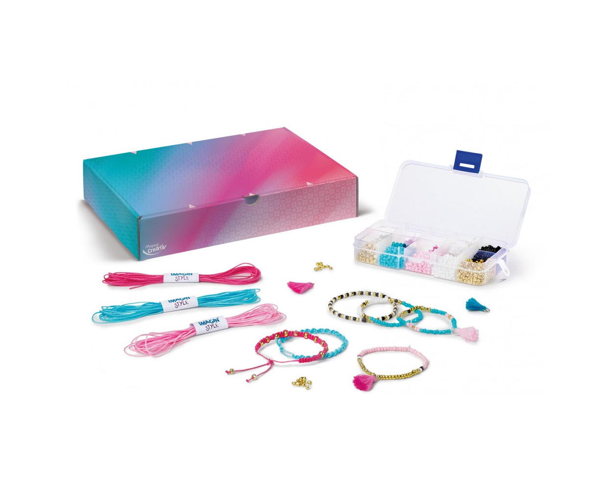 Μια συναρπαστική δραστηριότητα! Φτιάξτε 16 βραχιολάκια χρησιμοποιώντας δύο διαφορετικές τεχνικές χρησιμοποιώντας το κουτί. το οποίο μπορεί να χρησιμοποιηθεί αργότερα ως αποθηκευτικός χώρος για τις δημιουργίες σας. Η συσκευασία περιλαμβάνει κλωστές (3x 450cm) , λευκό ελαστικό νήμα (250cm), χάντρες 4,1mm : χρυσό , ασημί, (2x25), πέρλες 3mm : χρυσές , μαύρες, λευκές, μπλε, ροζ (5x10g) , πομπον (x4), 1 Κουτί αποθήκευσης για χάντρες, 1 διακοσμημένο κουτί με θήκες για αποθήκευση, 1 εγχειρίδιο.