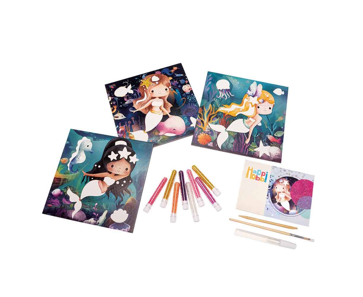 Ένα σετ χειροτεχνίας, με εκπαιδευτικό περιεχόμενο, που μαθαίνει στο παιδί να διακοσμεί προτυπωμένες καρτολίνες χρησιμοποιώντας χάντρες, απεικονίζοντας όμορφες γοργόνες. Το παιδί μαθαίνει να πειραματίζεται με χρώματα και υφές, αναπτύσσοντας τη λεπτή του κινητικότητα κατά τη διακόσμηση καρτών.