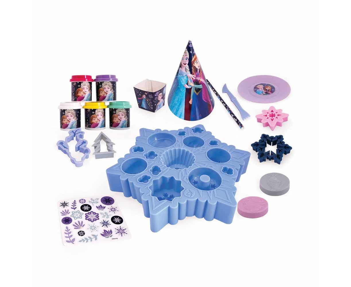 Ετοίμασε το πιο λαμπερό πάρτυ παρέα με τις αγαπημένες σας Άννα και Έλσα. Στήστε το σετ και φωνάξτε τους φίλους σας. Χρησιμοποιήστε την φαντασία σας και δημιουργήστε λαχταριστές δημιουργίες με τα αξεσουάρ Frozen και τα διάφορα χρώματα της πλαστελίνης.