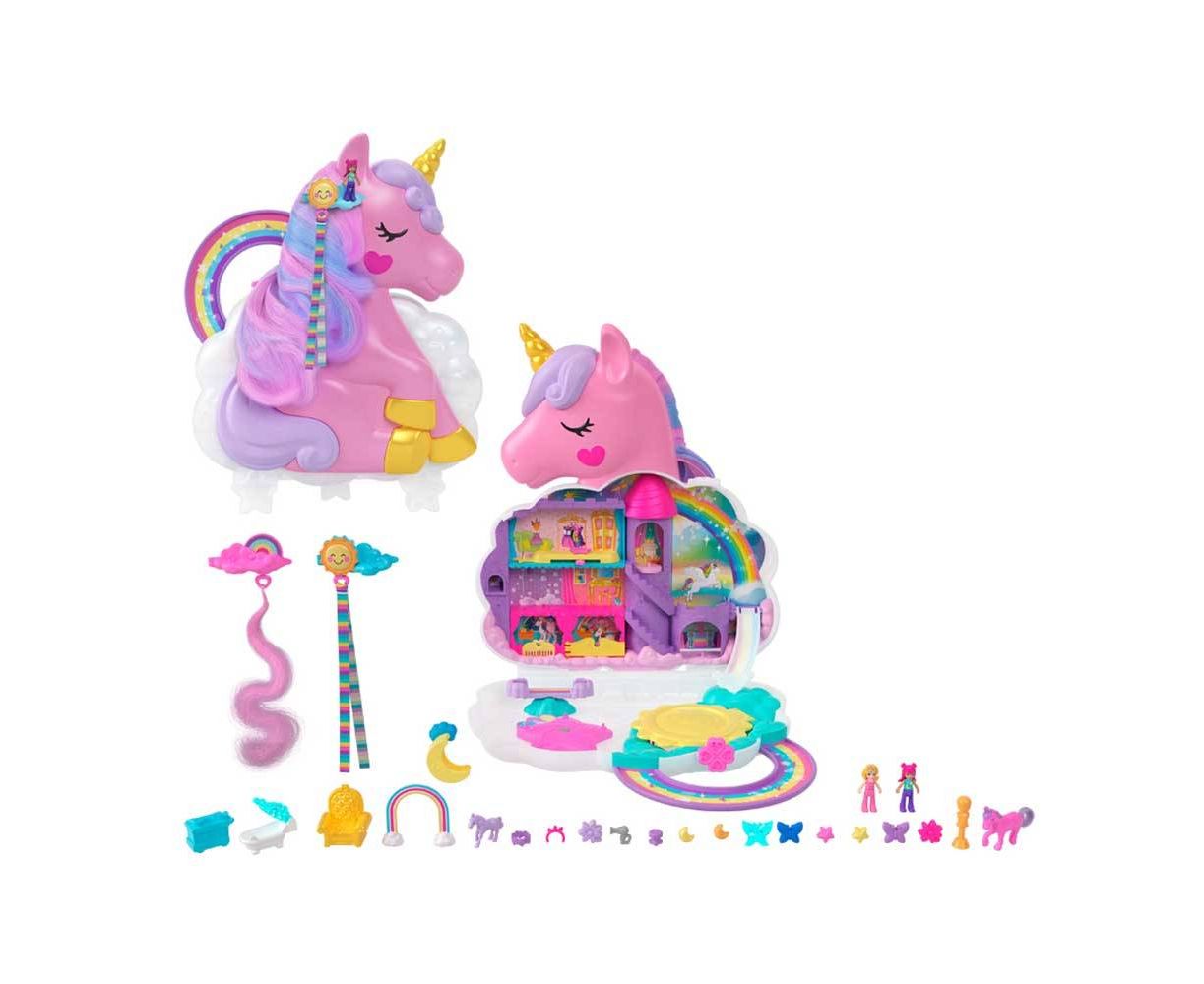 Το Polly Pocket Rainbow Unicorn Salon συνδυάζει μια μαγική ποσότητα διασκέδασης σε ένα παιχνίδι 2 σε 1 είναι ταυτόχρονα ένα κεφάλι styling και σετ παιχνιδιού κομμωτηρίου και 1 σετ παιχνιδιού 3 ορόφων στο εσωτερικό! Τα παιδιά μπορούν να βουρτσίσουν και να φορμάρουν τα εξωτερικά απαλά μαλλιά του μονόκερου με τη συμπεριλαμβανόμενη χτένα και 2 κλιπ μαλλιών που μπορούν να χρησιμοποιήσουν και τα παιδιά ένα με κορδέλα και ένα άλλο με πολύχρωμη επέκταση!