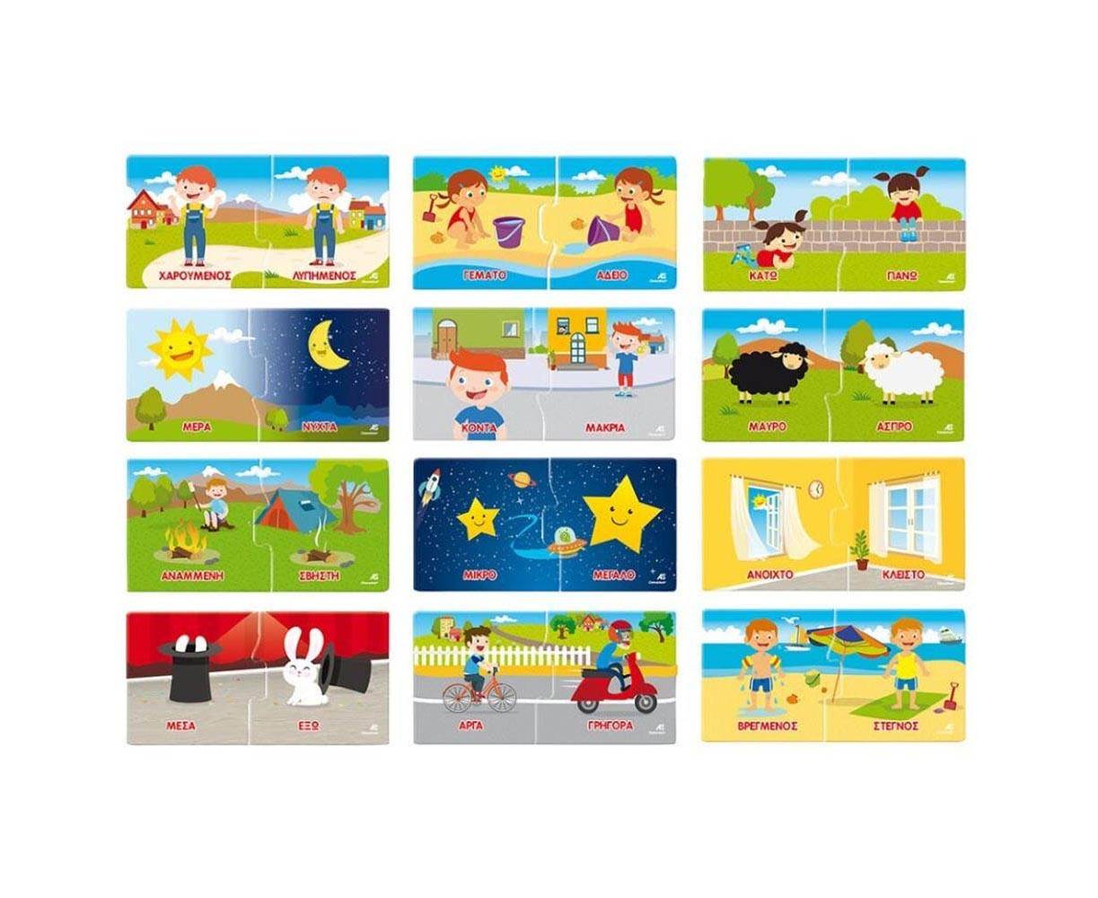 Ένα απλό και διασκεδαστικό εκπαιδευτικό παιχνίδι, σχεδιασμένο για να διδάξει στα παιδιά προσχολικής ηλικίας πολλές νέες λέξεις, χάρη στη βοήθεια των εικόνων που χρησιμοποιούνται για να περιγράψουν ζεύγη αντίθετων καταστάσεων. Αφού αφαιρέσετε τα χάρτινα πλαίσια από τις κάρτες-παζλ, το παιδί πρέπει να παρατηρήσει προσεκτικά κάθε εικόνα και για κάθε κάρτα την κάρτα που ταιριάζει και η οποία παρουσιάζει την αντίθετη κατάσταση. Η μέθοδος αυτοδιόρθωσης επιτρέπει στα παιδιά να ελέγχουν τους συνδυασμούς των καρτών χωρίς τη βοήθεια ενήλικα. Με εύκολο τρόπο το παιχνίδι αυτό βοηθάει τα παιδιά να αναπτύξουν την παρατηρητικότητα και τις λογικές δεξιότητες, βελτιώνοντας την κατανόηση αντίθετων αντικειμένων, ενεργειών και καταστάσεων.