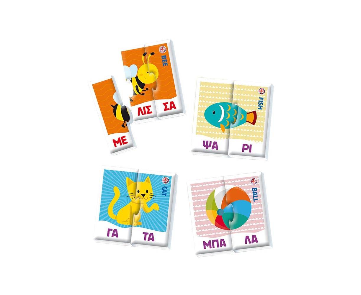 Ένα διασκεδαστικό εκπαιδευτικό παιχνίδι, ειδικά σχεδιασμένο για παιδιά ηλικίας 4 ετών και άνω. Περιέχει πολύχρωμες εικονογραφημένες κάρτες σε δύο γλώσσες για την πρώτη προσέγγιση του συλλαβισμού και της ανάγνωσης από τα παιδιά με ευχάριστο τρόπο. Ξεκινώντας από απλές λεξούλες, το παιδί αρχίζει να κατανοεί τους μηχανισμούς που καθορίζουν το χωρισμό των λέξεων σε συλλαβές και μέσα από χαρούμενες εικόνες και διασκεδαστικά παιχνίδια μαθαίνει να συλλαβίζει και να διαβάζει.