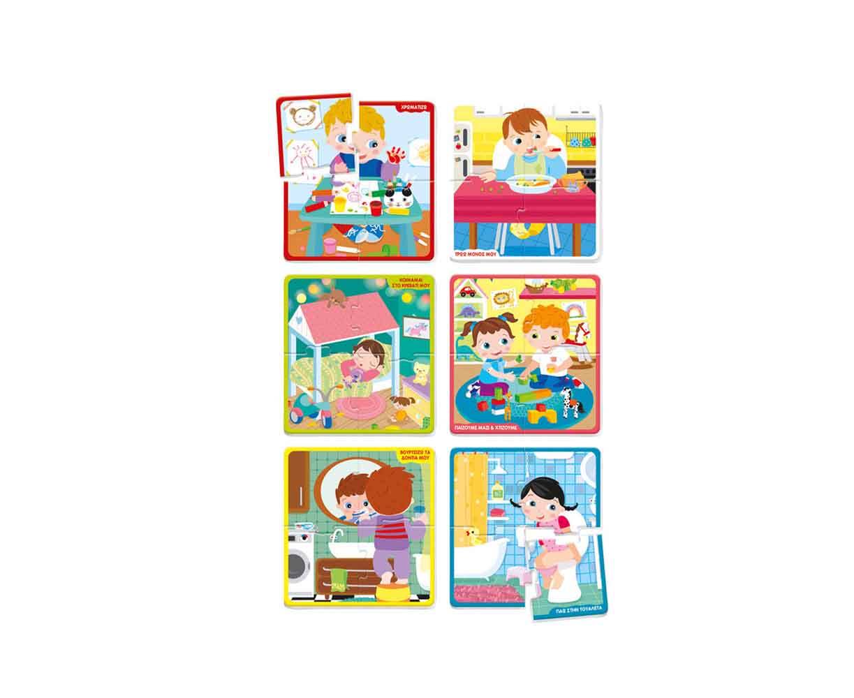 Μόλις το παιδί εξοικειωθεί με το παιχνίδι, μπορείτε να ανακατέψετε τα κομμάτια και από τα 6 παζλ και να βοηθήσετε το παιδί να αναγνωρίσει τα 4 κομμάτια της κάθε εικόνας και να τα συνδέσει σωστά μεταξύ τους.
