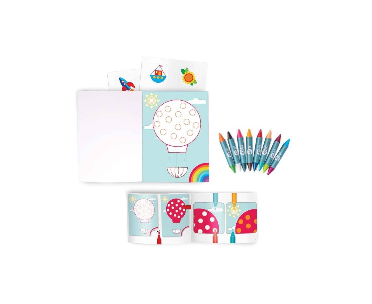 Στη συνέχεια μπορεί να ταιριάξει τα αυτοκόλλητα που εικόνων που περιλαμβάνονται με τις αντίστοιχες ζωγραφιές που έχει ολοκληρώσει, αναπτύσσοντας έτσι την αντίληψη και την παρατηρητικότητά του. Διασκέδαση, μάθηση και δημιουργικός χρόνος μακριά από οθόνες.