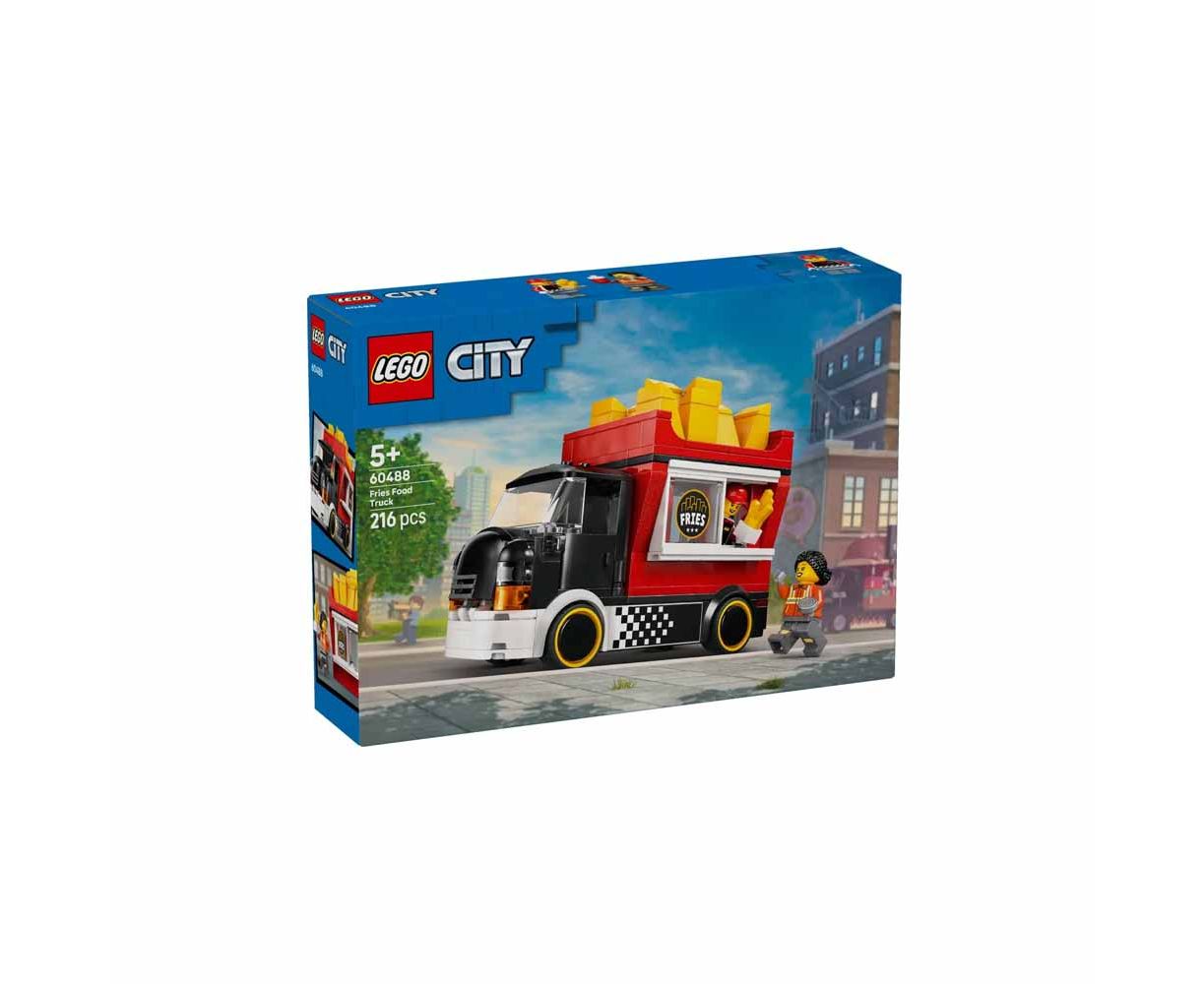 Το fast food γίνεται παιχνιδάκι με αυτό το σετ κατασκευής LEGO City Fries Food Truck (60488) για ηλικίες 5 ετών και άνω το πολύχρωμο φορτηγό-καντίνα διαθέτει αποσπώμενο κιόσκι που μοιάζει με τεράστιο κουτί με τηγανητές πατάτες. Τα παιδιά αφαιρούν την οροφή για πρόσβαση σε έναν λεπτομερή χώρο προετοιμασίας φαγητού, εξοπλισμένο με φριτέζα, καρυκεύματα και συρόμενο παράθυρο εξυπηρέτησης. Αυτό το μοντέλο καντίνας fast food διαθέτει καπό που ανοίγει με κινητήρα και συνοδεύεται από μίνι φιγούρες πωλητή και πελάτη. Αυτό το σετ παιχνιδιού με τρόφιμα είναι υπέροχο δώρο για 5χρονα αγόρια και κορίτσια που απολαμβάνουν τις LEGO κατασκευές και τις ευρηματικές ιστορίες. Προσθέστε το σε άλλα (πωλούνται ξεχωριστά) από τη σειρά LEGO City για περιπέτειες σε όλη την πόλη. Τα παιδιά μπορούν να κατασκευάσουν αυτό το φορτηγό φαστ φουντ με αυτοπεποίθηση χρησιμοποιώντας την εφαρμογή LEGO Builder – όπου ζουμάρουν και περιστρέφουν σε 3D και παρακολουθούν την πρόοδο με απλές ψηφιακές οδηγίες. Το σετ περιέχει 216 τεμάχια.