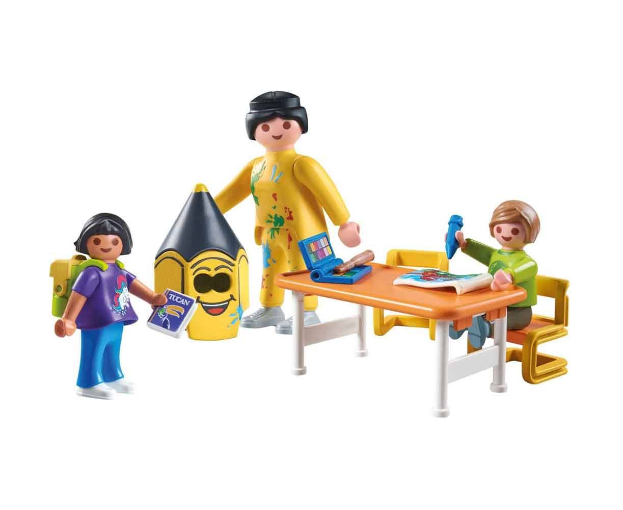 Η πρώτη μέρα στο νηπιαγωγείο έφτασε και είναι γεμάτη από διασκεδαστικές εκπλήξεις! Με τη χρωματιστή μάσκα μολυβιού, η δασκάλα φέρνει χαρά και δημιουργικότητα στην τάξη, κάνοντάς την ημέρα αυτή αξέχαστη. Οι φιγούρες PLAYMOBIL μπορούν να κρατήσουν όλα τα αξεσουάρ που περιλαμβάνονται, όπως βιβλία, στυλό και ακόμη και ένα κουτί με χρώματα, προσφέροντας ατελείωτες δυνατότητες ρόλων. Οι σχολικές τσάντες ανοίγουν για να αποθηκεύσουν μικροσκοπικά υλικά, ιδανικά για φανταστικό παιχνίδι.