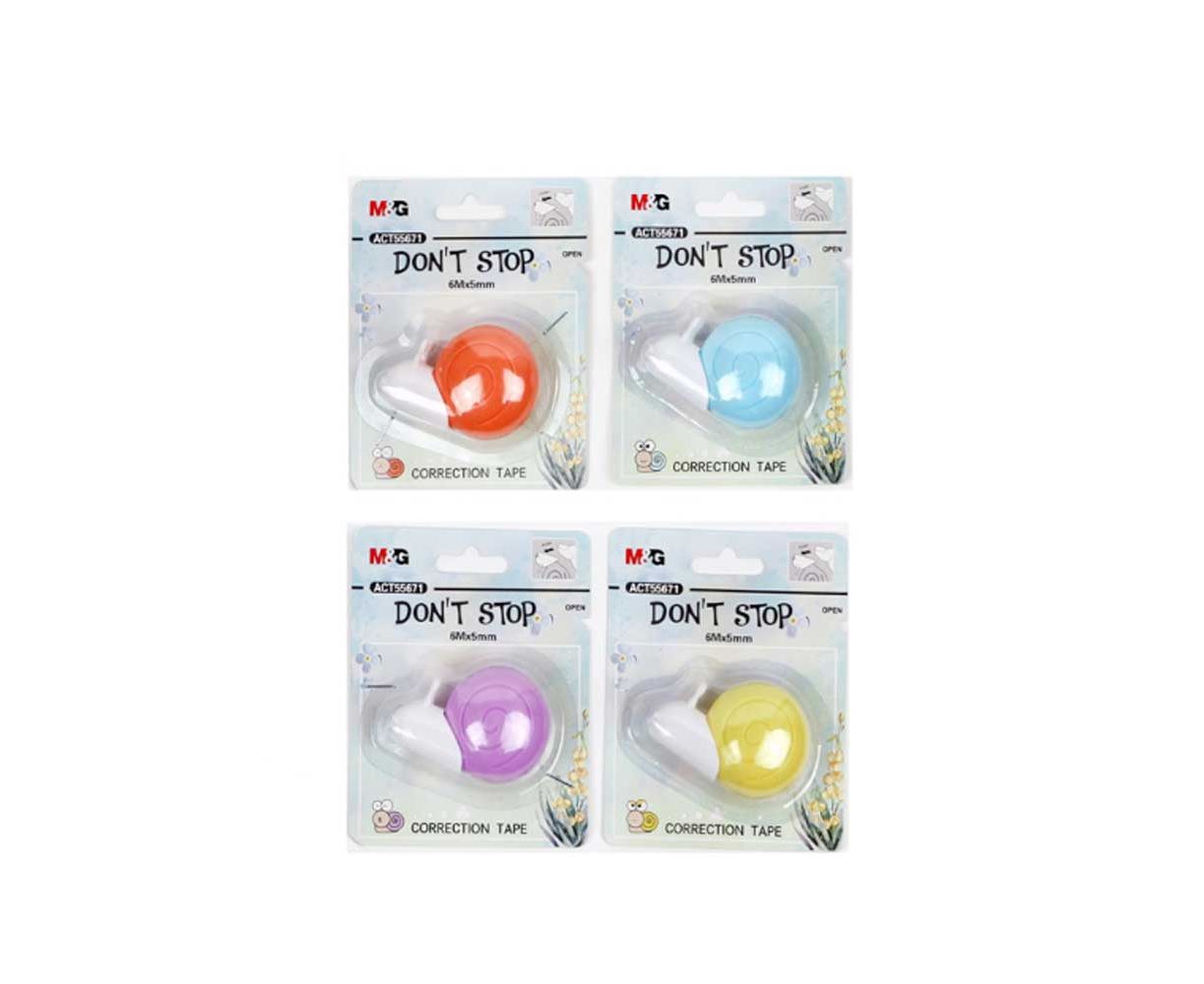 Διορθωτής σε ταινία - Σαλιγκάρι, 6 m 5 mm. Παρέχει στεγνή επιφάνεια. Μπορείτε να γράψετε αμέσως μετά τη χρήση. Διάφορα χρώματα σχεδίων.