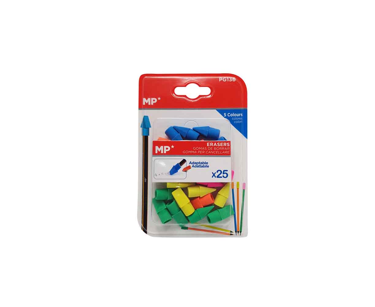 Σετ γόμες MP σε σχήμα καπακιού για τοποθέτηση σε μολύβια σε διάφορα χρώματα.
