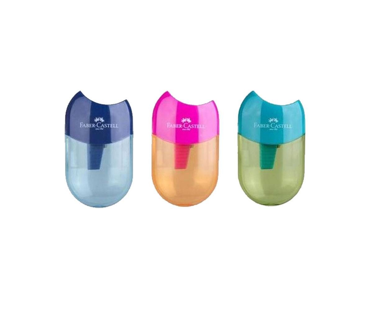 Πλαστική ξύστρα με καπάκι και κάδο της Faber Castell, κατάλληλη για μολύβια και ξυλομπογιές. Μέγεθος ικανό για να χωράει στην κασετίνα σας.