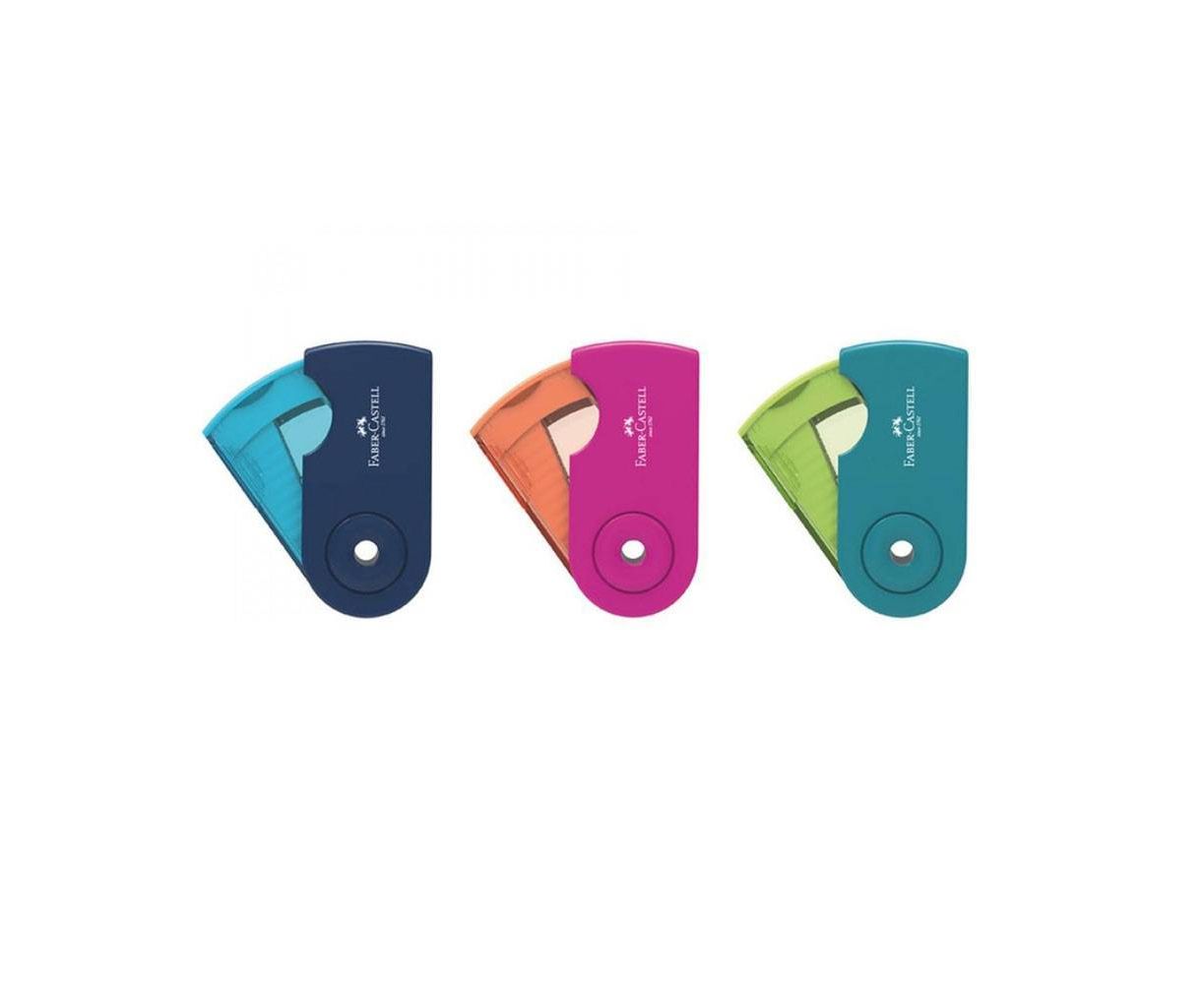 Ξύστρα μονή βαρελάκι Faber Castell Sleeve mini Color 182712, με αποθηκευτικό χώρο που ανοίγει και κλείνει. Ξύνει τέλεια και δεν επιτρέπει διαρροές στα ξύσματα. Επιλογή τριών pastel χρωμάτων.